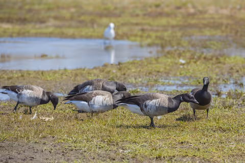 Brant Geese primarily forage for food by swimming into shallow water, and tipping themselves forward to gain access to aquatic vegetation, which makes up most of their diet (3). Eelgrass, widgeon grass, green algae, and rockgrass are among their favorite aquatic plans to eat. Brant Geese also eat some aquatic insects, worms, and mollusks (3). In recent decades, it has been discovered that some Brant Geese have started patronizing upland fields to graze on grass (2).