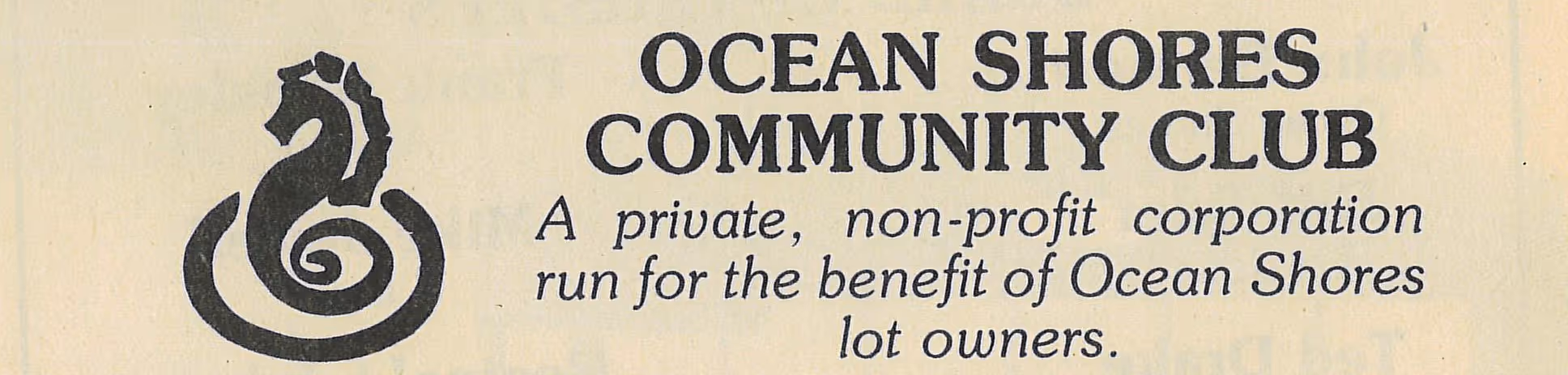 Despite this, when Ocean Shores Estates began developing what would later become the City of Ocean Shores, they made the seahorse their official logo. As such, it appeared everywhere on materials for Ocean Shores Estates and their ventures, including the Community Club and the Golf Club. The logo featured a seahorse with their tail coiling behind their body, sometimes with the seahorse’s tail nestled within the capital “O.”