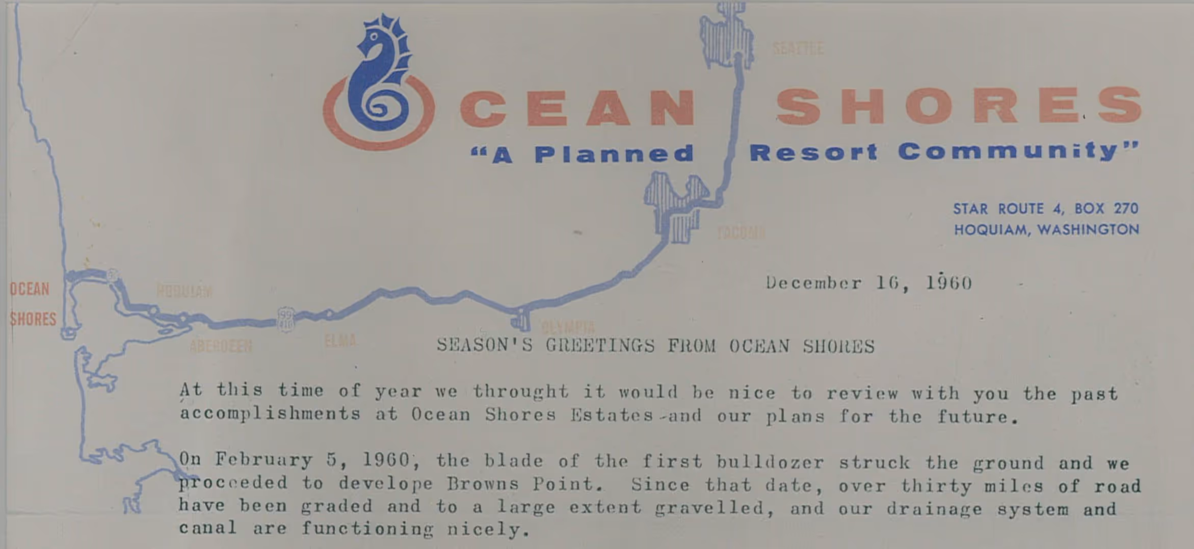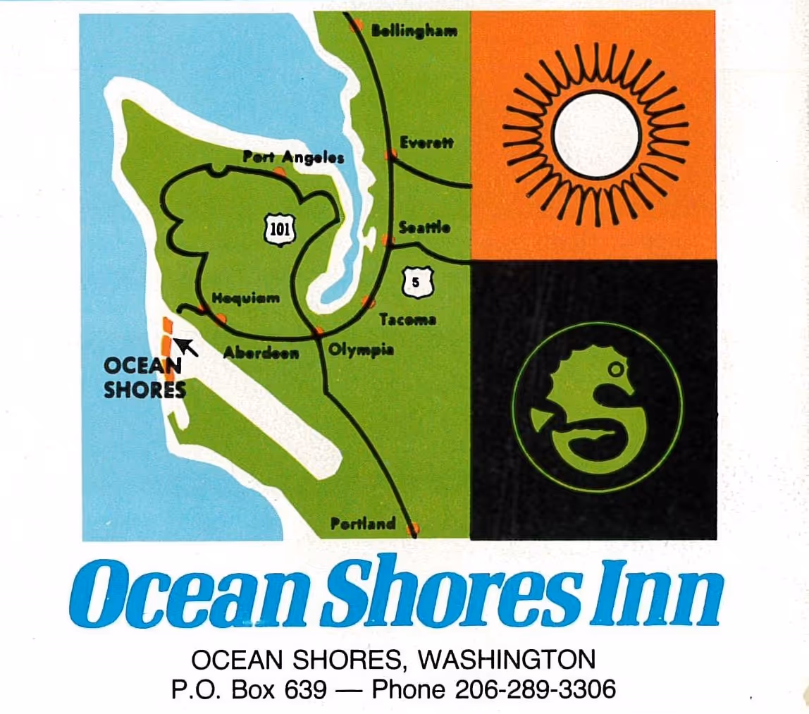 It was often depicted alongside a map of Western Washington showing the major highways leading to Ocean Shores and a sun, much like this graphic.