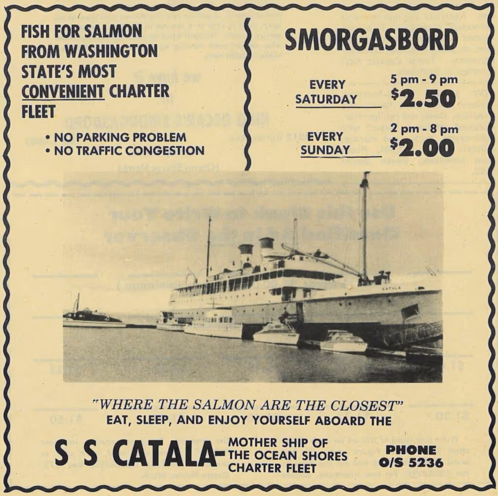 The Catala did not begin its life as a “boatel” in Ocean Shores. It was initially brought in to serve as a temporary lodging facility during the 1962 Century 21 World’s Fair in Seattle. When planning the fair, the number of lodging facilities in Seattle was not considered to be sufficient for the number of visitors they were expecting. To ensure enough accommodations would be available, a group of Seattle businessmen purchased the Catala to serve as a floating hotel. The Catala was one of several vessels serving in this capacity at the fair.